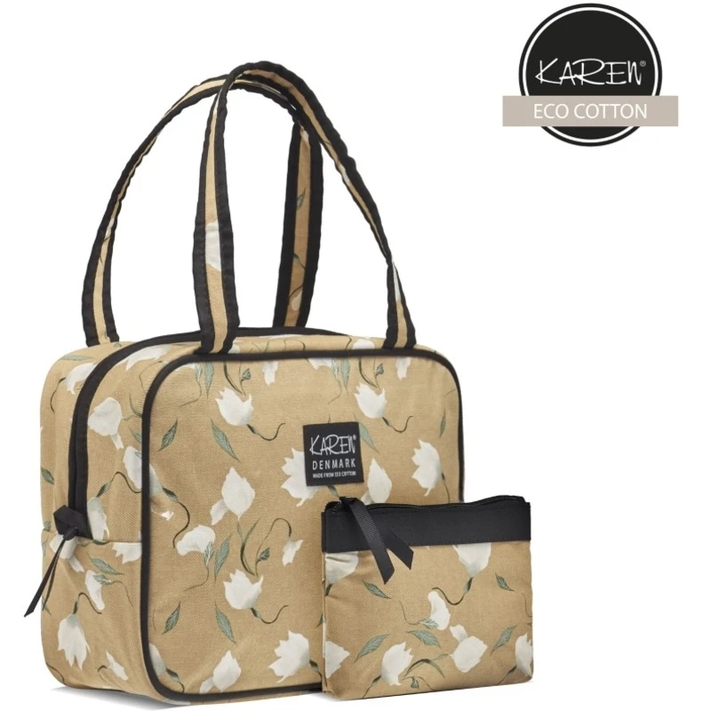 Gillian Jones Karen Set – ECO Cotton Beige er et fint sæt bestående af en stor og rummelig toilettaske, samt en mindre makeuppung i beige med hvidt blomsterprint. Den store taske er med lynlås, to håndtag, et stort rum, samt 4 lommer indeni, så man kan organisere alle sine produkter. Den lille tilhørende pung er ligeledes med lynlås, og er perfekt til de mindre makeupprodukter. Begge tasker kan maskinevaskes ved 30 grader, så de altid kan holdes rene og pæne.
