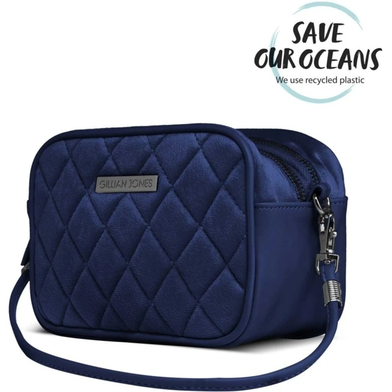 Gillian Jones Natascha Cosmetics Bag Small – Dark Blue Velvet er en smuk og stilet toiletpung i det blødeste mørkeblå velour. Den har to store rum, hvor der i det ene er en lomme med lynlås, som kan bruges til opbevaring af mindre ting, som f.eks. kontaktlinser, hårclips osv. Der medfølger en aftagelig rem, som kan bruges på to måder. Ved at sætte begge ender fast i samme ende af tasken, så man får en ‘hank’ at holde tasken i. Derudover kan man også spænde remmen fast i hver sin ende, og ens makeuppung forvandler sig nu til en håndtaske.
